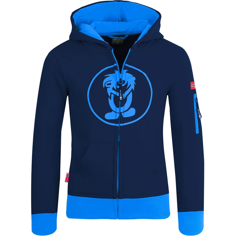 Die Sortland Jacke von Trollkids ist eine bequeme Alltags-Sweat-Jacke für Jungs und Mädchen mit großer lässiger Kapuzen und offenen Kängurutaschen.Der Materialmix macht sie angenehm weich und leitet Feuchtigkeit schnell ab, falls man doch mal ins Schwitzen kommt.